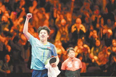 温瑞博在半决赛中慑服张本智和后庆祝 新华社记者 黄伟 摄
