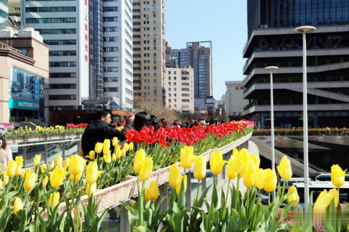 近日,上海市徐汇区天桥上及徐家汇公园里各色郁金香竞相洞开,蛊惑市民旅客拍照打卡。(陈亚东摄/光明图片)