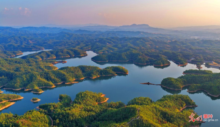 3月17日,江西省赣州市会昌县文武坝镇林富村石壁坑水库左近青山环绕、树木茁壮,组成一幅水清岸绿的生态画卷。(朱海鹏摄/光明图片)
