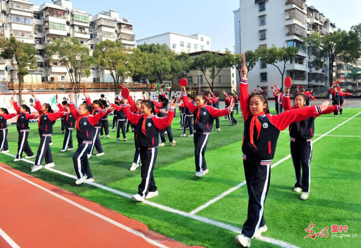 湖北省宜昌市秭归县实验小学学生在大课间锻练乒乓球韵律操。(王辉富摄/光明图片)