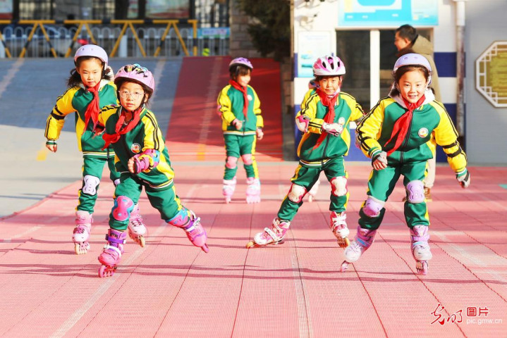 河北省张家口市东风小学愚弄大课间开展轮滑、冰壶等活动,让同学们感受冰雪通顺的兴盛。(岑屹摄/光明图片)