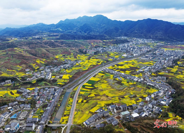 三月中旬,陕西省汉中市宁强县数万亩梯田油菜花过问盛花期。远眺望去,油菜花田重重叠叠,与连绵的青山、曲折的公路等相映澄净,组成一幅春日乡村画卷。(吴天文摄/光明图片)