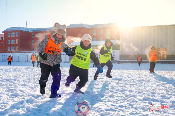 2025年12月24日,内蒙古额尔古纳市第三小学的学生们愚弄大课间在雪地上伸开足球拒抗赛。(吕昊俊摄/光明图片)