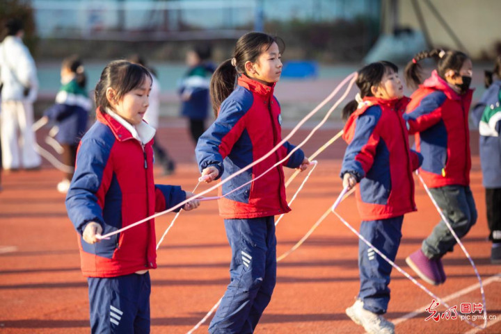 江西省九江市都昌县湖滨学校的学生在操场跳绳。(傅建斌摄/光明图片)