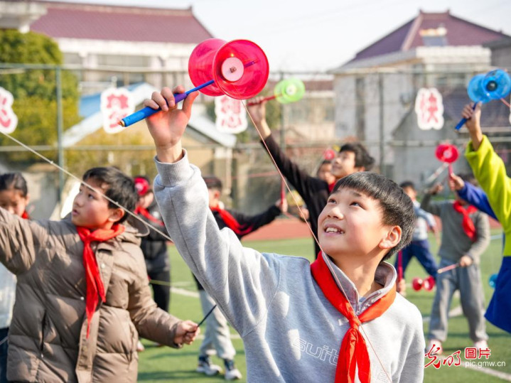 江苏省南通市通州区金余小学学生愚弄课间在操场上锻练抖空竹。(翟伟凯摄/光明图片)