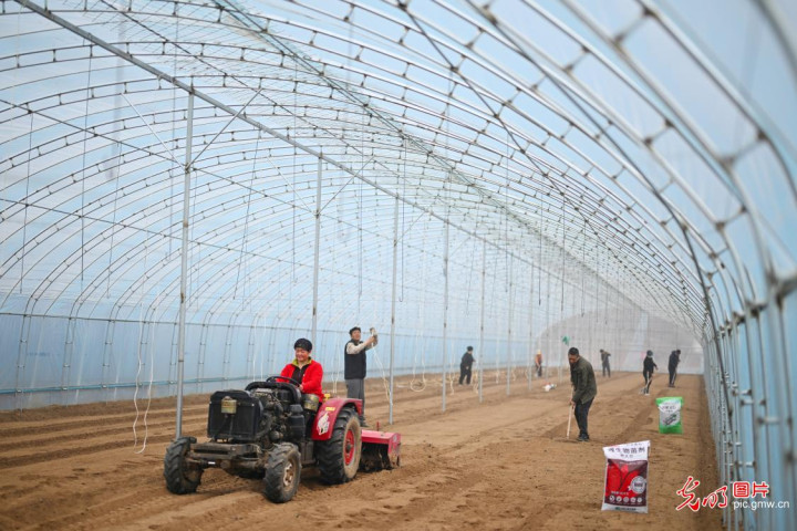 2月27日,在河北保定市白沟新城大高村,村民在农业栽种园里深耕整地、起垄施肥。(孙浩龙摄/光明图片)