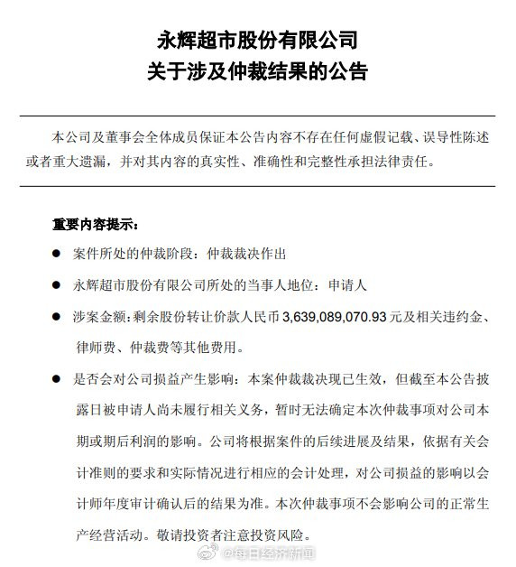 证实公告本色,永辉超市股份有限公司近日收到上海外洋经济贸易仲裁委员会投递的《裁决书(上国仲(2024)第3170号)》。苦求东说念主为永辉超市股份有限公司。第一被苦求东说念主为大连御锦贸易有限公司,第二被苦求东说念主为王健林,第三被苦求东说念主为孙喜双,第四被苦求东说念主为大连一方集团有限公司。