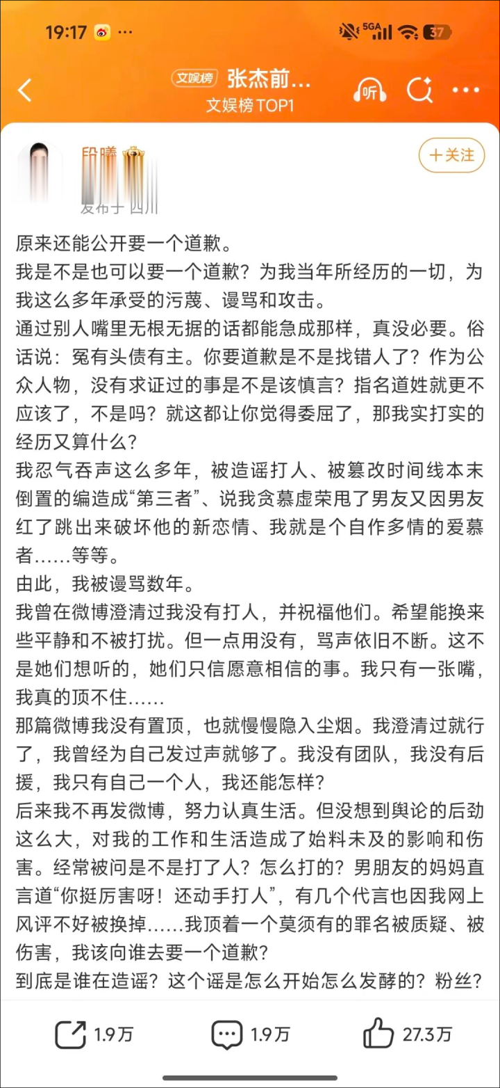 请你正视我方的言行,为被你无端牵连的张杰,认真说念歉。