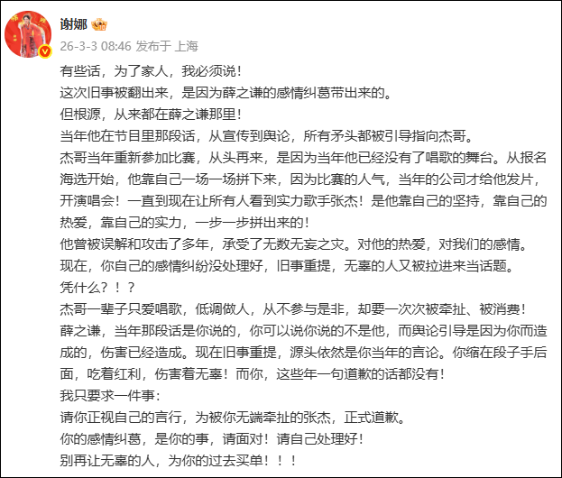 3月3日清晨,谢娜发微博公开喊话薛之谦,条款薛之谦给张杰说念歉: