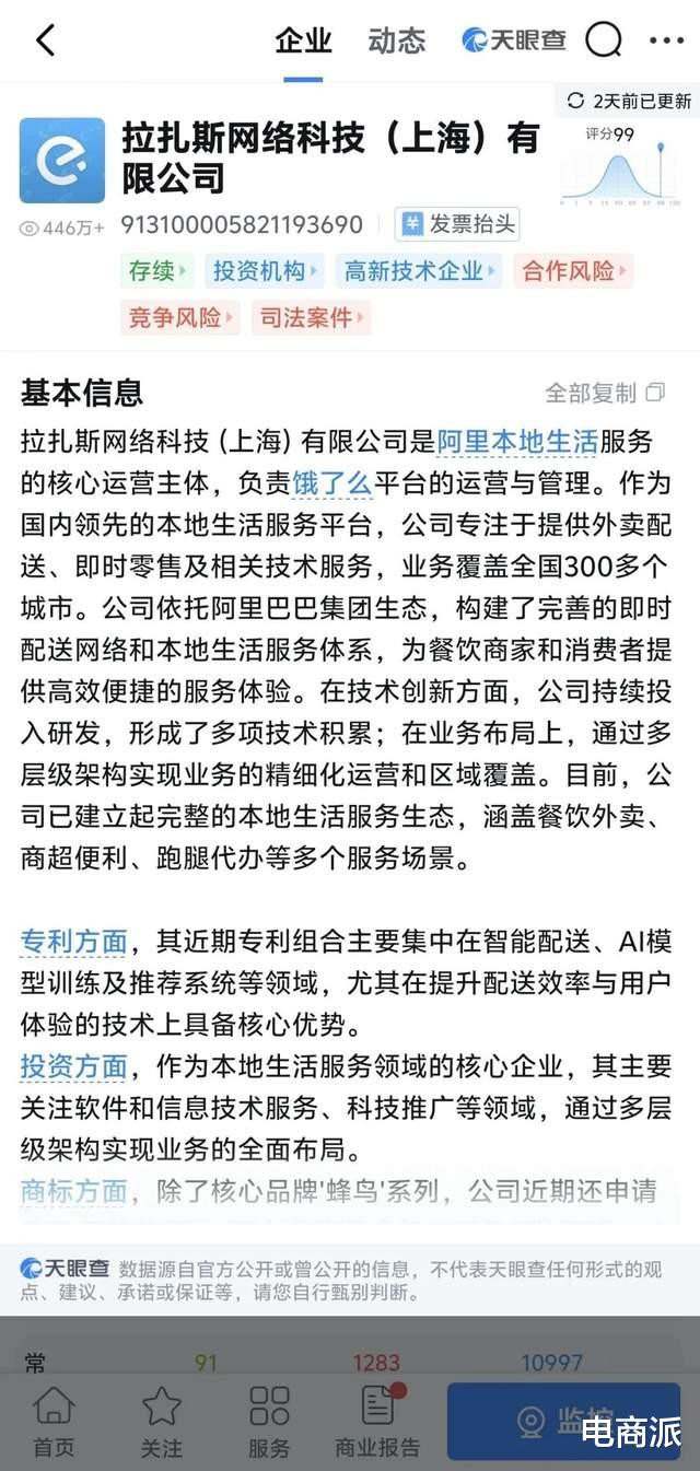 李响通过查询发现,拉扎斯网罗科技(上海)有限公司是阿里土产货生活服务的中枢运营主体,认真饿了么平台的运营与料理。