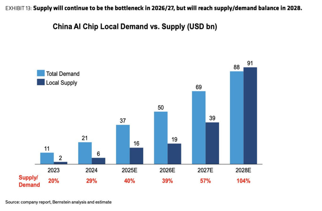 据国外投行伯恩斯坦的《中国AI芯片市集范畴施展》裸露,2025年中国AI芯片市蚁集,英伟达和华为占比差未几都是40%(英伟达稍微最初),寒武纪、海光、阿里平头哥、百度昆仑芯等紧随后来。2026年,华为展望将占据中国AI芯片市集近50%的份额。