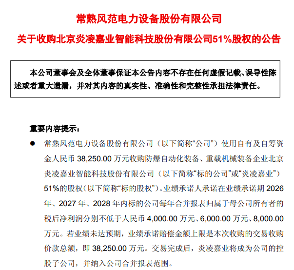 公告显示,针对此次交易,标的公司创始人杨海峰作为业绩承诺人,承诺标的公司2026年、2027年、2028年内每年合并报表归属于母公司所有者税后净利润分别不低于4000万元、6000万元、8000万元。