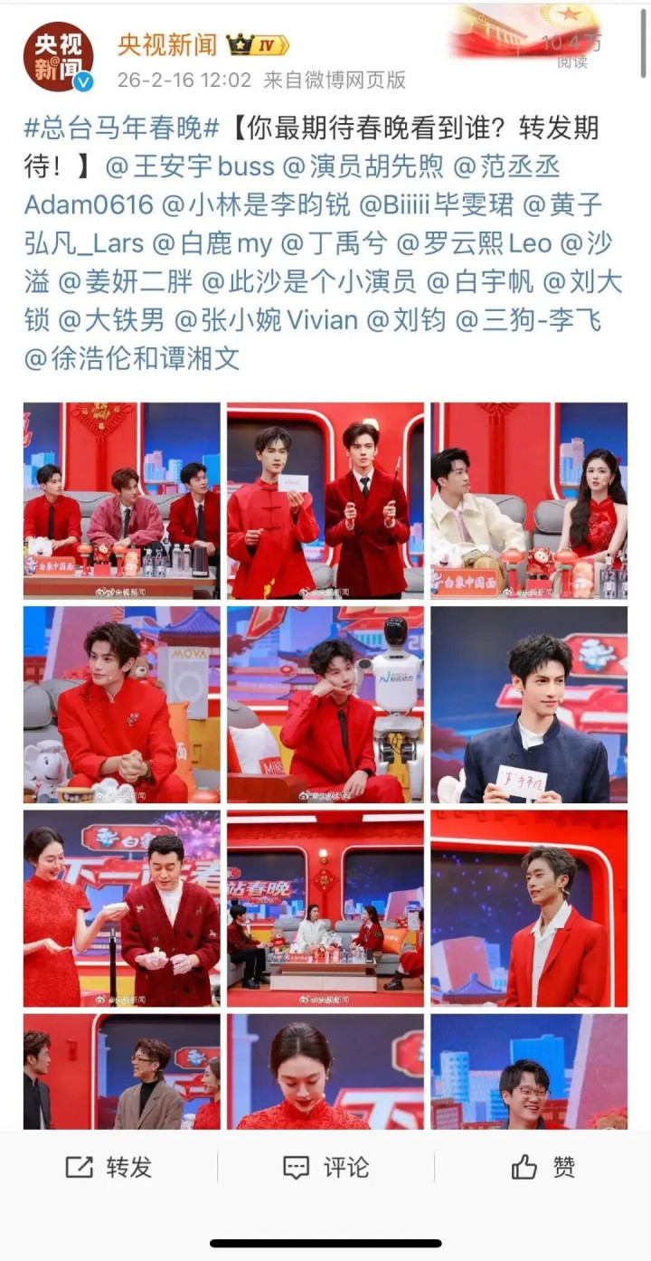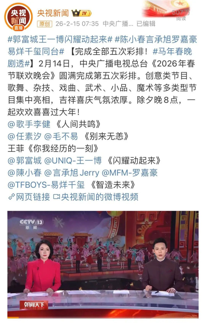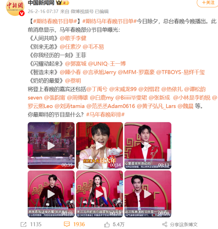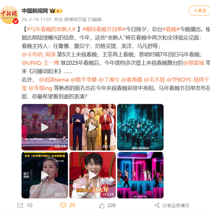当天除夕,总台春晚今晚播出。此前音书显现,马年春晚部分节目单曝光: