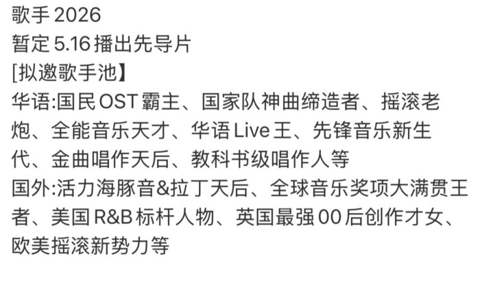 一言以蔽之,把柄拟邀名单来看,这季《歌手2026》早已高出平淡音综的鸿沟,注定会成为年度爆款,书写华语音综的全新神话。