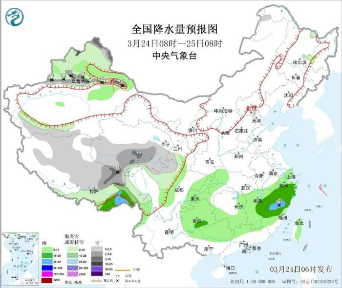 中新网3月24日电据中央形状台网站24日音讯,昨日,青海东部、西藏东部、四川西北部等地出现小到中雪或雨夹雪,局地大雪;贵州东部及江南中北部等地出现中到大雨,局地暴雨。改日三天,天气方位无彰着变化,青藏高原东部和新疆北部等地有雨雪天气,西南地区东部、江南等地晦暗连绵。