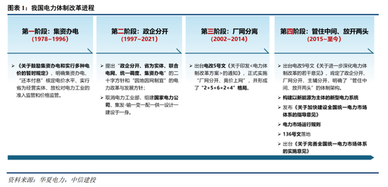 1)第一阶段(1978-1996):集资办电。国度孤苦办电策画管制体制难以沸腾发展需求,集资办电拉开我国电改序幕。1978年,我国发电装机缺口达1000万千瓦,发电量缺口达400亿千瓦时。传统的电力体制(国度独资办电策画管制体制)难以沸腾发展需求。1985年5月,国务院颁布《对于饱读舞集资办电和实行多种电价的暂行规矩》,明确集资办电、“还本付息”原则阻滞电价水平、实行省为谋划实体、收缩对电力工业的准入监管和价钱监管等措施,以激活电力阛阓活力。千般电力公司、电厂快速发展并各自谋划,进入自负发展阶段,导致国度难以进行融合调度。