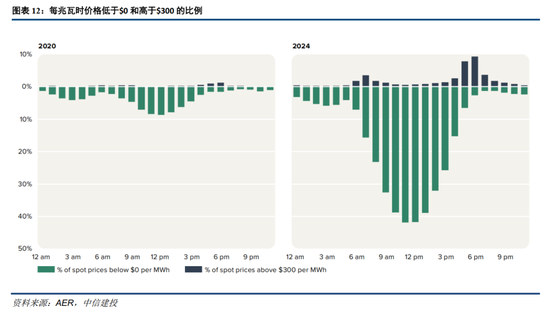 (1)可再生能源占比连接擢升,极致的价钱波动与负电价成为常态。适度2025年,NEM可再生能源发电占比已达42.9%,而2015年这一比例仅为14%。瞻望到2030年,燃煤发电沸腾的电力需求比例将下落至电网的17%和总电力的14%。到2050年,NEM的燃煤发电瞻望将为零。到2030年,电网领域的风能和太阳能瞻望将沸腾电网65%的电力需求,到2050年将达到88%。燃气发电、水力发电、电板储能和消耗能源资源瞻望将沸腾剩余需求。在高高傲浸透率地区,负电价已成常态。2024年四季度,NEM举座负价时段占比达到23.1%,南澳大利亚州和维多利亚州局部季度负价时段致使高达30%—48%。字据AEMO知道的具体数据,新南威尔士州、维多利亚州和南澳大利亚州也创造了负价钱频率的区域记录,离别为13.3%、34.3%和38%。现货价钱允许在-1000至17500澳元/MWh的极宽区间内波动,是全球日内价差最大的阛阓之一。