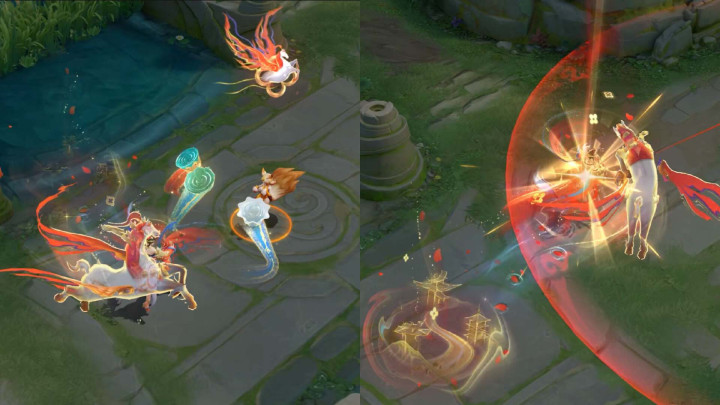 然后再来看一下回城殊效,狗尾续蝉的这个回城殊效嗅觉作念得卓著的喜庆,因为是金红色为主题,但举座来看亦然比较高档的