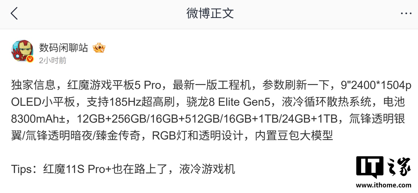 IT之家 4 月 14 日音信,博主 @数码闲话站 今天在微博爆料,红魔游戏平板 5 Pro 最新一版工程机搭载 9 英寸 2400*1504p OLED 屏幕。
